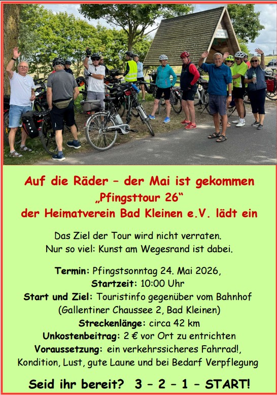 Kategorien Heimatverein Bad Kleinen e.V. Datum 24 Mai 2026 Uhrzeit 10:00 geführte Radtour Teile diese Veranstaltung + Zu Google Kalender hinzufügen + iCal / Outlook exportieren