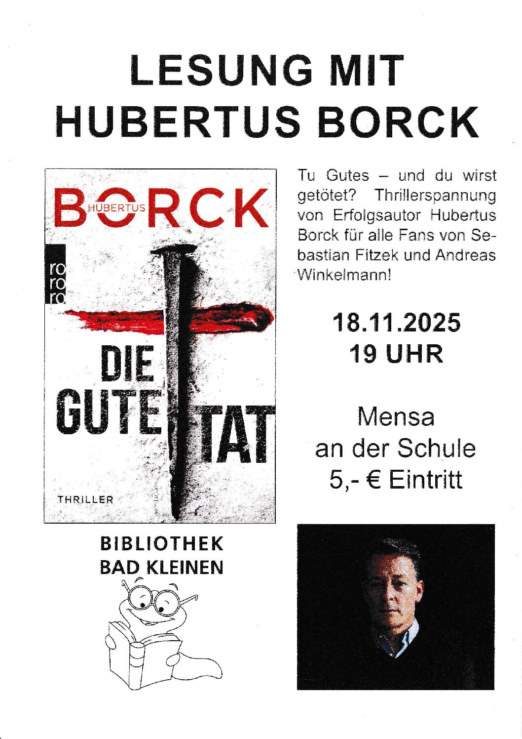 Kategorien Bibliothek Datum 18 Nov. 2025 Uhrzeit 19:00 Lesung mit Hubertus Borck Die Lesung findet in der Mensa an der Schule statt. Eintritt: 5,00 € Teile diese Veranstaltung + Zu Google Kalender hinzufügen + iCal / Outlook exportieren